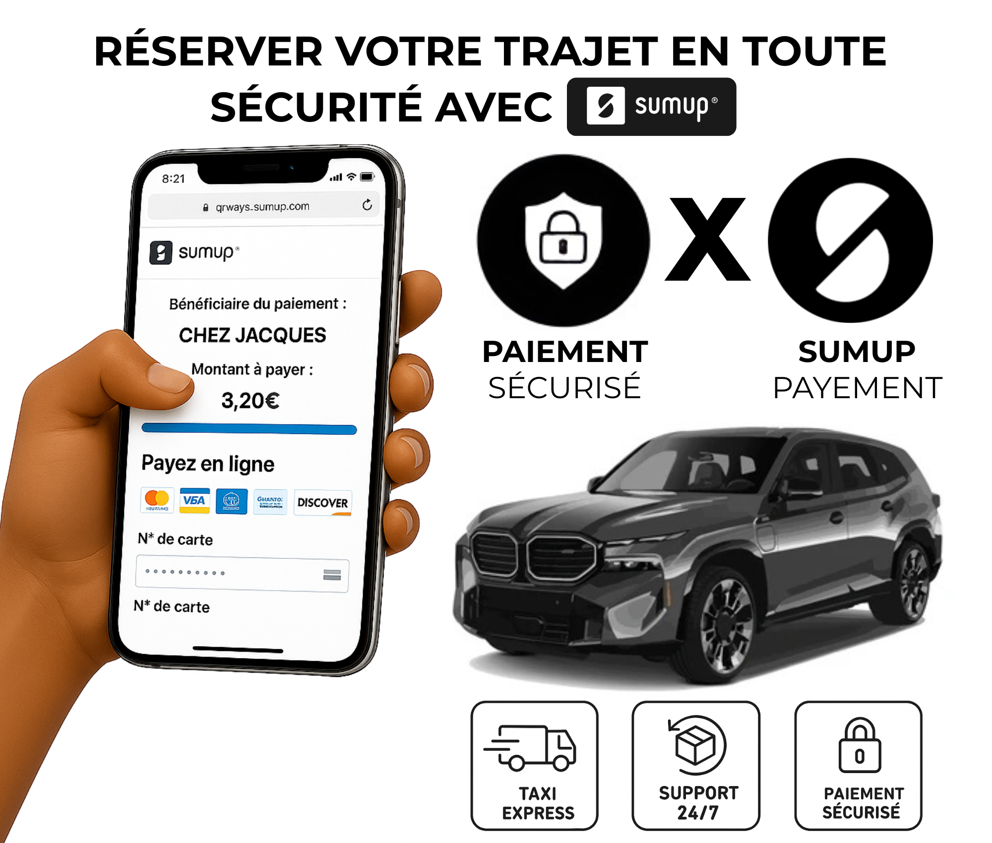 Avec notre service, réserver un taxi n’a jamais été aussi rapide. En seulement 3 étapes simples, vous êtes pris en charge immédiatement ou à l’heure souhaitée, avec un paiement 100 % sécurisé via SumUp.